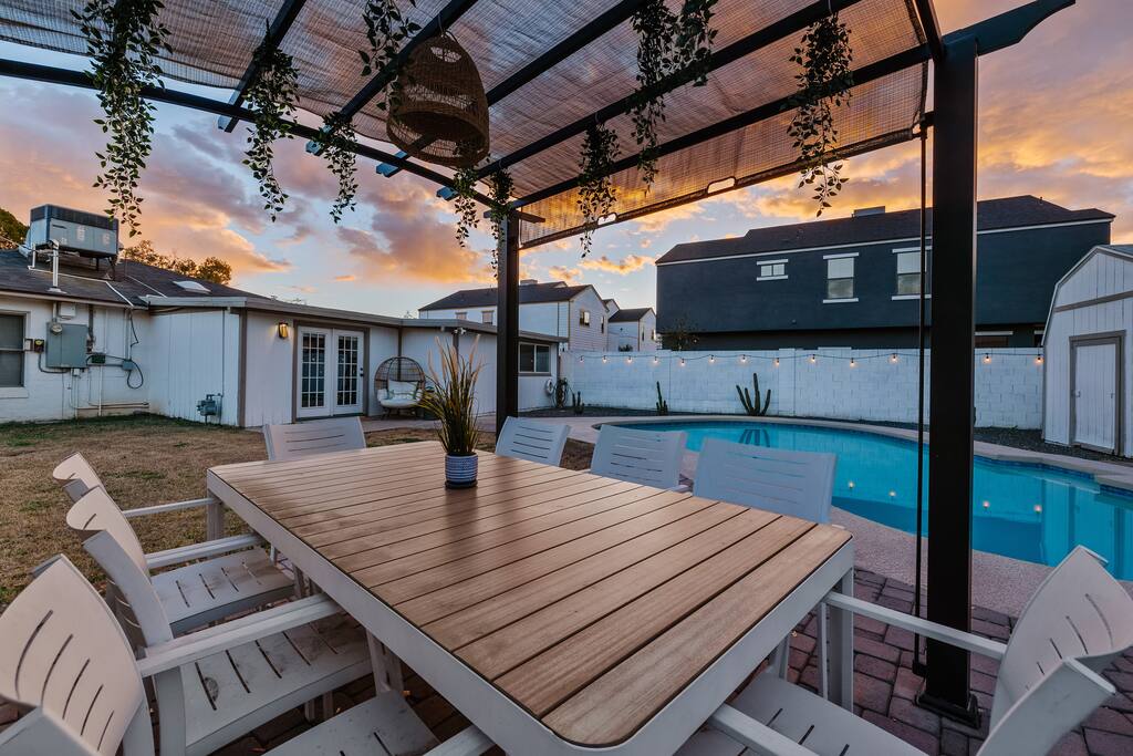Welcome to Kingdom Kribs! Step into luxury with our heated pool, complete with relaxing lounge chairs, fire pit and outdoor dining. Immerse yourself in this stylish and spacious retreat with designer interiors. This stunning home combines modern luxury with cozy comfort, offering everything you need for an unforgettable stay. Perfectly located in the heart of Phoenix, you’ll be centrally located to vibrant dining, shopping, and nightlife scenes in the valley.